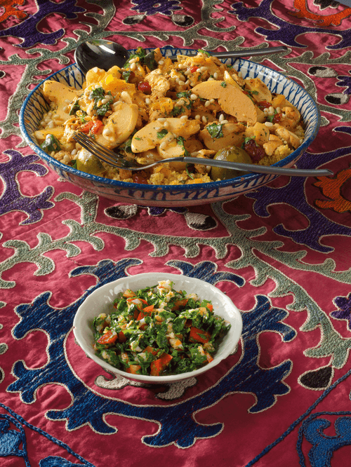 Кускус с курицей, айвой, шафраном, курагой и сушеной вишней