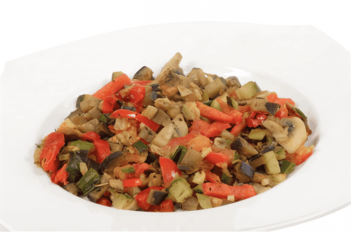 Репчатый лук нарезаем соломкой, обжариваем на масле. Добавляем к нему мелко нарезанную морковь. Через 2 минуты кладем баклажаны, кабачки, нарезанный соломкой болгарский перец (2 красных и 1 желтый) и мелко нарезанный большой помидор (предварительно нужно снять с него кожицу).