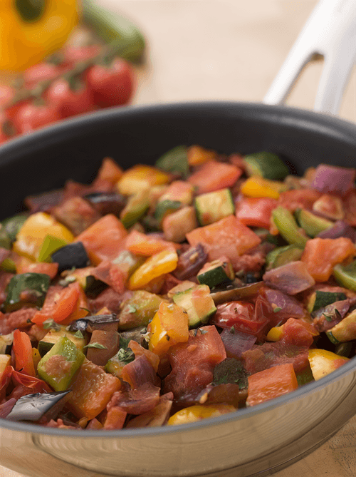 Добавьте сахар в смесь лука и помидоров, и шумовкой переложите к ним же перец. Потом добавьте картофель и кабачок. Посолите и готовьте, помешивая, 5 минут. Перед тем, как подавать – вмешайте в рататуй слегка взбитое яйцо.