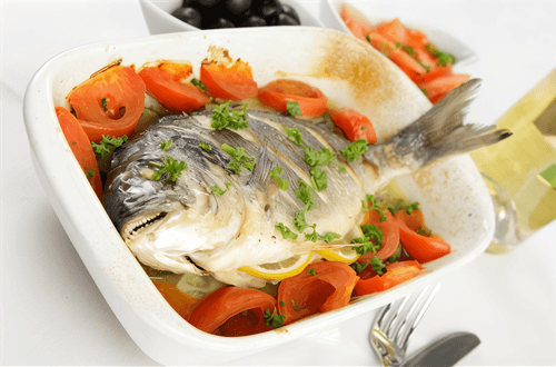 Очищенную, выпотрошенную, промытую и обсушенную полотенцем дораду укладываем на противень, в который предварительно наливаем оливковое масло.