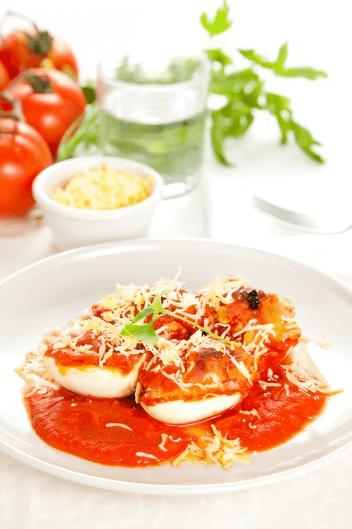 Яйца в томатном соусе — это яркое сочетание простоты и изысканности. Томаты придают соусу насыщенный кисло-сладкий вкус, который великолепно сочетается с мягкостью яичного белка и нежностью желтка. Легкий аромат тимьяна и белого вина добавляет утонченную глубину, а грибы придают текстуру и дополнительную насыщенность. Такой рецепт может иметь корни в средиземноморской кухне, где яйца часто готовят с томатами и травами. Это блюдо идеально подходит как для уютного семейного ужина, так и для утреннего завтрака с богатым вкусом. Подавать его лучше горячим, когда яйца пропитываются ароматным томатным соусом, создавая гармонию вкусов в каждом кусочке. Его можно дополнить свежим хлебом или хрустящими тостами, чтобы насладиться каждой каплей насыщенного соуса.