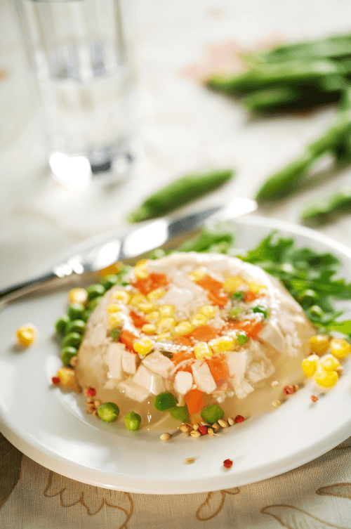 Замочите желатин в чашке с холодной водой, обычно на литр желе требуется 30 грамм желатина, но вы все же сверьтесь с инструкцией на упаковке. Пока желатин размокает, разогрейте бульон почти до кипения и вмешайте в него желатин. Уберите посуду с огня и дайте будущему желе остыть, иногда перемешивая.