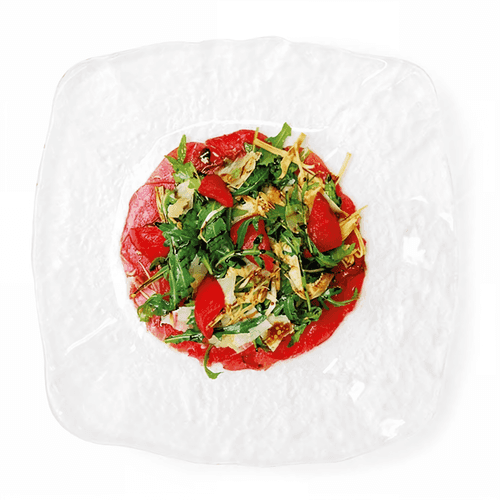 Заправленные продукты выложить на карпаччо, украсить помидорами конфи, полить выдержанным бальзамиком и посыпать черным перцем из мельницы.