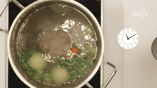 Параллельно надо разогреть куриный бульон и развести в нем щепотку шафрана. Этим самым бульоном залить рис с овощами и курицей, посолить, поперчить и бросить туда же несколько горошин черного перца и варить десять минут на небольшом огне. Бульон может выкипать интенсивнее, чем вы планировали, его недостаток можно восполнять дополнительными инъекциями куриного бульона, воды или белым сухим вином.