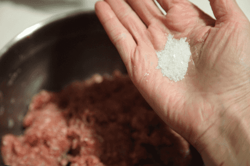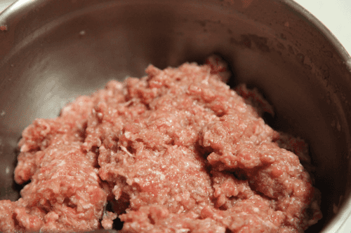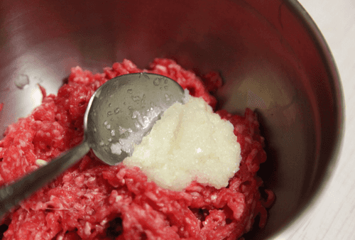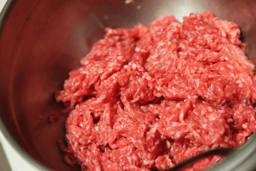Измельчить мясо в мясорубке.