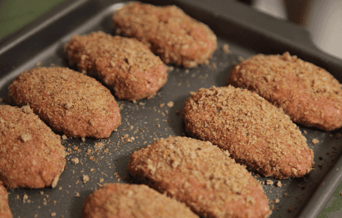 Обвалять котлеты в панировке и выложить на противень, на дно налить немного воды (тонким слоем). Разогреть духовку до 200 градусов. Поставить котлеты в духовку на полчаса.