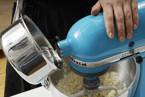 Медленно, вымешивая лопаткой тесто, влить кипяток.