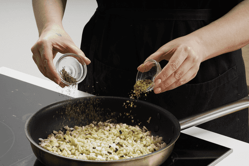 Баклажаны нарезать маленькими кубиками и обжарить вместе со специями в небольшом количестве растительного масла.