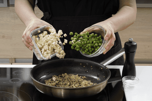 Добавить мелконарезанный (или раскрошенный) тофу, горошек (если он замороженный — разморозить). Поперчить, посолить.