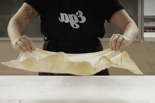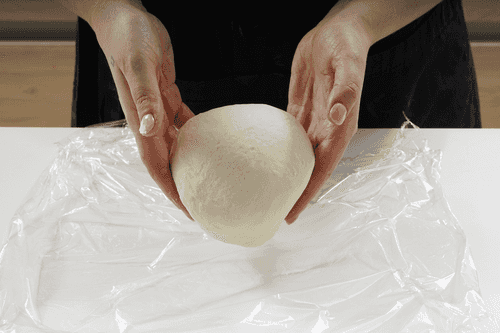 Вымесить тесто до упругого состояния, оно не должно липнуть к рукам. Если все-таки липнет — добавить еще немного муки. Скатать тесто в шар, накрыть пленкой или крышкой и оставить на 30 минут — час.