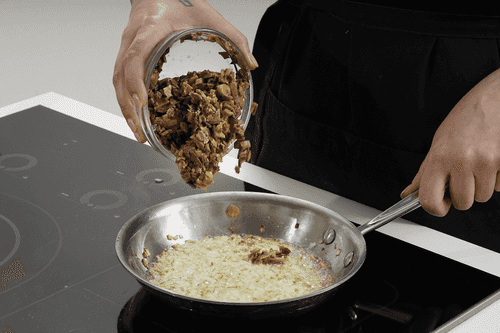 На растительном масле обжарить оставшиеся грибы и мелконарезанную луковицу.
