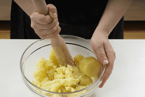 Картофель очистить, отварить в подсоленной воде до готовности и размять в пюре.