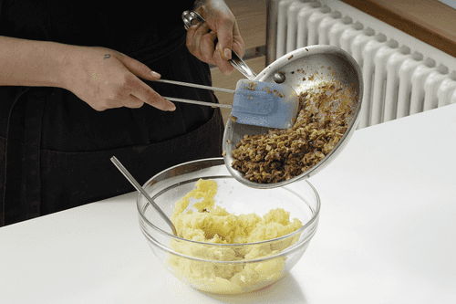Добавить к картофелю лук с грибами, посолить, поперчить.