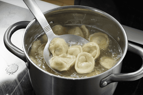 Отварить пельмени в кипящей подсоленной воде с половиной грибного отвара. Подождать, пока они всплывут, и варить 5 минут.