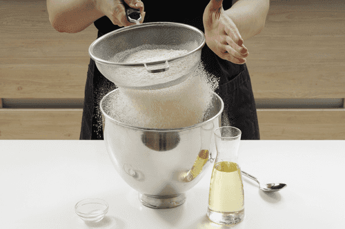 Муку просеять в миску, добавить соль и 2 столовые ложки растительного масла.