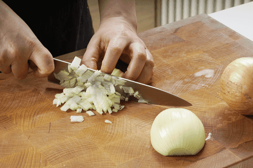 Приготовить начинку. Луковицу мелко нарезать и обжарить на растительном масле до мягкости.