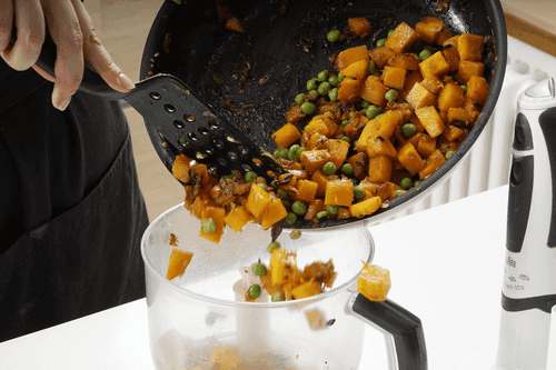 Добавить нарезанную кубиками тыкву и готовить до мягкости тыквы, около 15 минут. Добавить горошек и обжаривать все вместе еще 2 минуты.