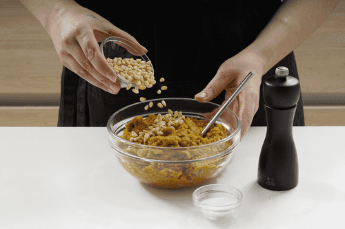 Добавить в начинку кедровые орешки, добавить мускатный орех, посолить и перемешать.
