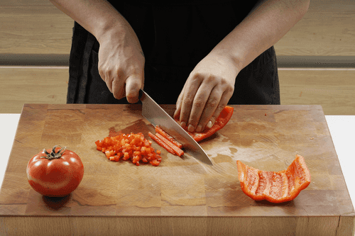 Приготовить соус. Перец очистить от семян и перегородок. Нарезать помидоры и перец кубиками со стороной 5 мм.