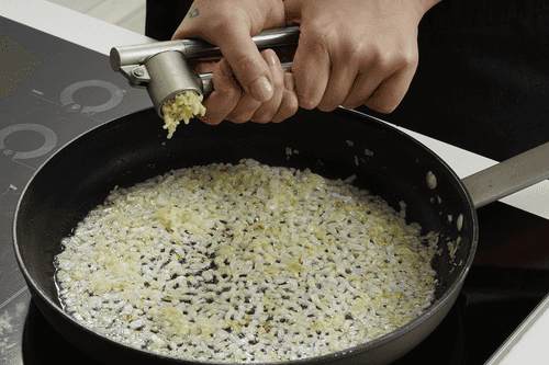 Мелко нарезать оставшуюся луковицу, чеснок пропустить через пресс. Обжарить лук и чеснок до золотистого цвета.