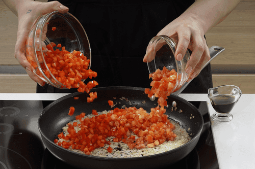 Добавить на сковороду помидоры и перец, посолить и готовить еще 5 минут.
