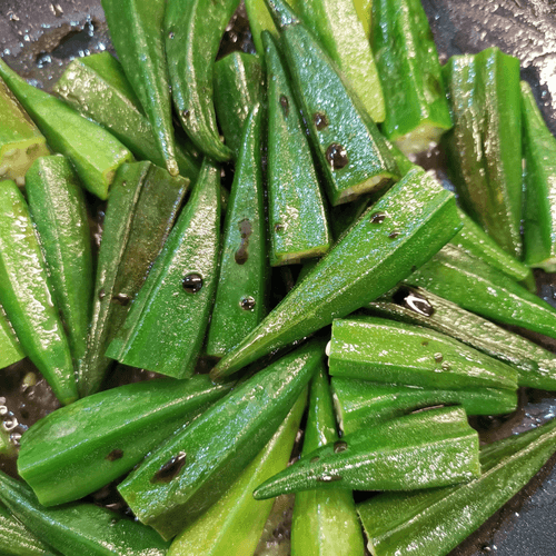 Бамию через 2 минуты перемешать. Обжаривать на среднем огне.