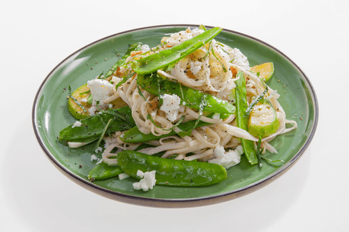Украсить лапшу с молодыми кабачками и фетой листьями мяты.