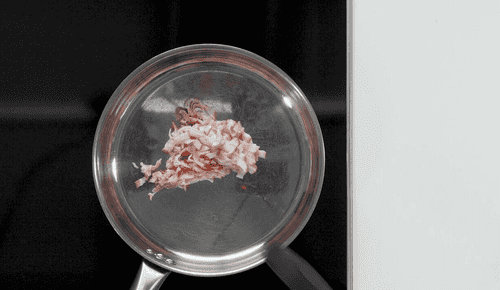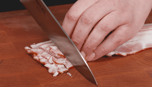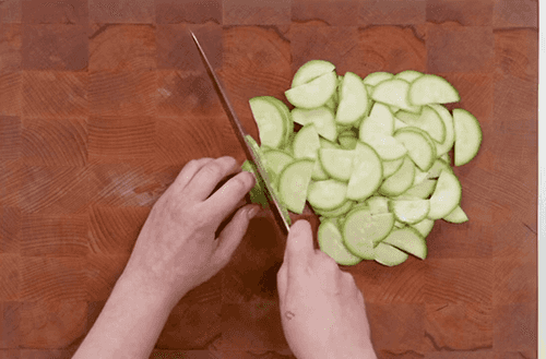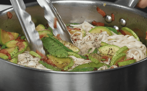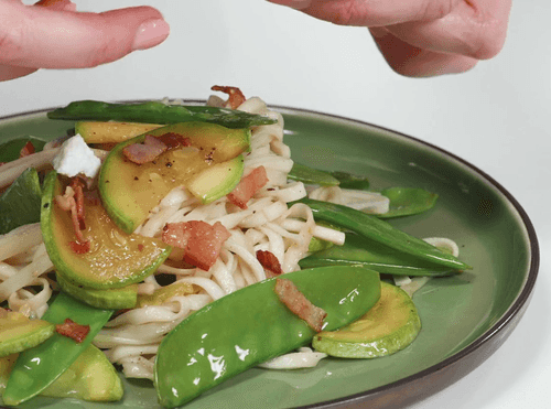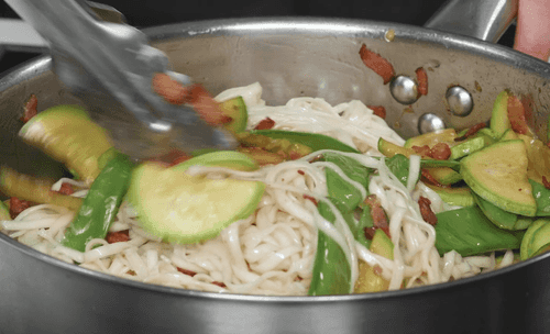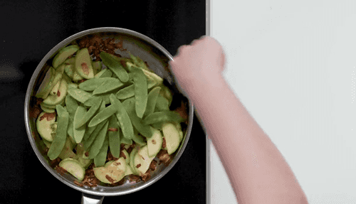 Когда бекон станет золотистым, добавить к нему кабачки и молодой стручковый горошек. Быстро обжарить на сильном огне.