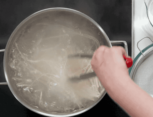 В большой кастрюле вскипятить воду, добавить чайную ложку соли. Закинуть в кастрюлю пшеничную лапшу и варить около минуты.