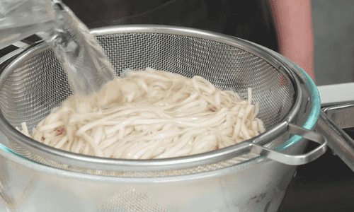 Затем откинуть на дуршлаг и быстро промыть под струей холодной воды.