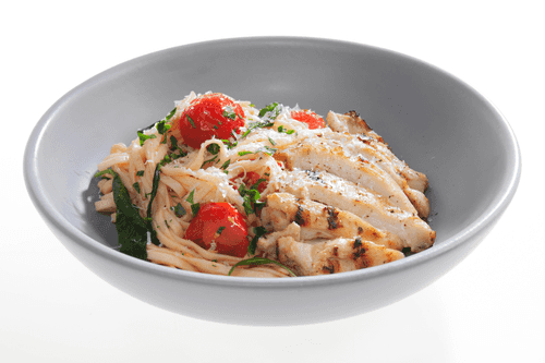 Выложить на тарелку нарезанную ломтиками курицу, рядом — лапшу. Посыпать тертым сыром и подавать.