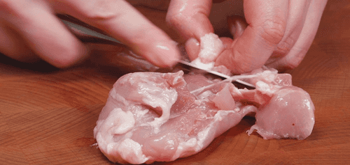 Избавить куриное филе от жилок и хрящей.