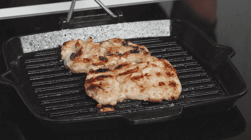 Обжарить курицу на среднем огне до золотистой корочки. Чтобы проверить, готова ли курица, ее нужно проткнуть ножом: если сок прозрачный, курица готова. Для красивых полосок можно использовать сковороду гриль.