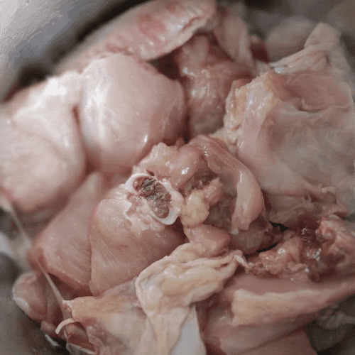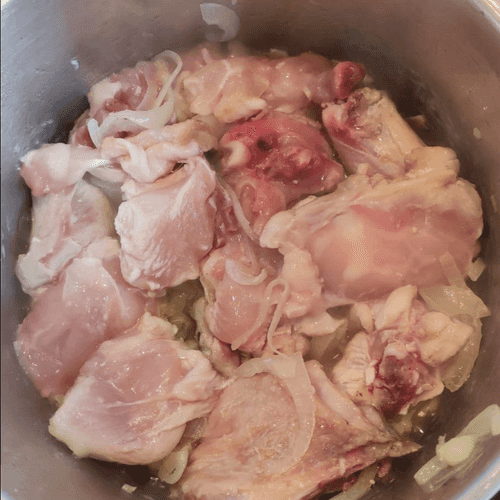 Добавить курицу в кастрюлю и хорошо перемешать.
