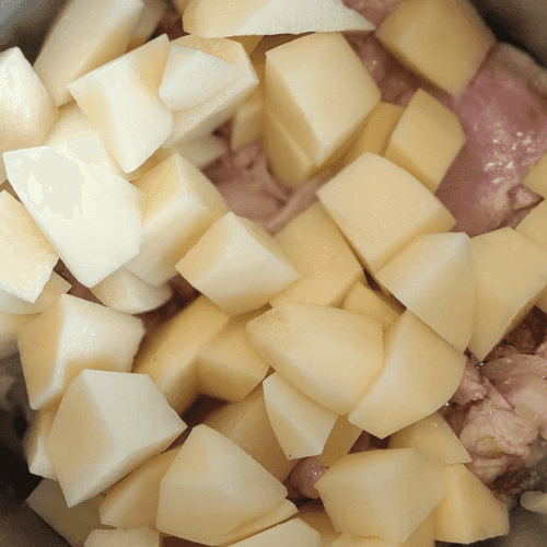 Затем накрыть крышкой, убавить огонь и продолжить тушить мясо с картошкой в собственном соку примерно 10–15 минут.