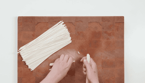 Поломать пшеничную лапшу на кусочки длиной 3–4 см.