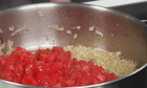 Добавить шафран, паприку и томаты, обжаривать на сильном огне, помешивая лопаткой, в течение 2 минут.