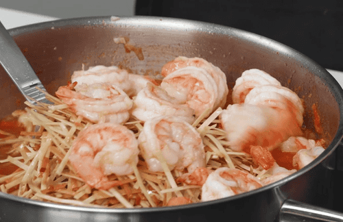 Добавить обжаренную лапшу, перемешать, сверху выложить креветки. Тушить еще 3–6 минут или около того под крышкой — процесс будет окончен, когда вся жидкость выпарится. Посолить по вкусу.