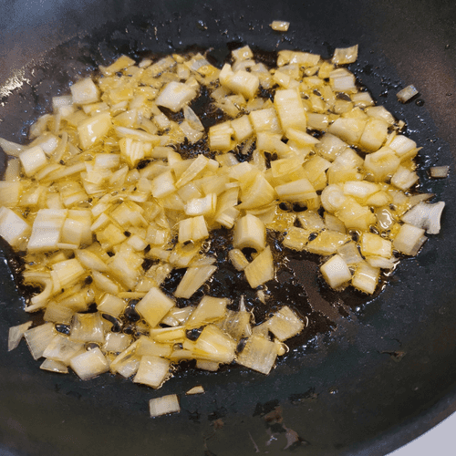 Лук крупно нарезать и отправить в разогретое на сковороде горчичное масло.