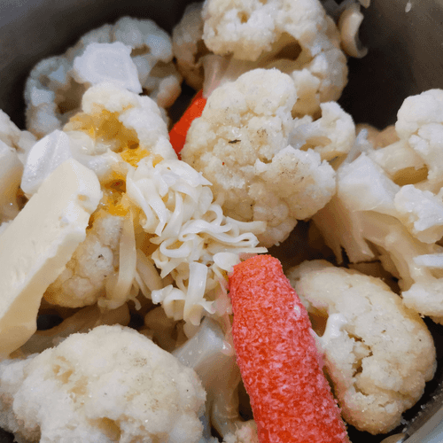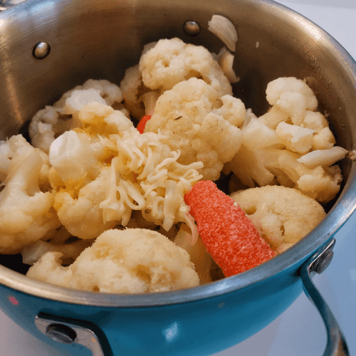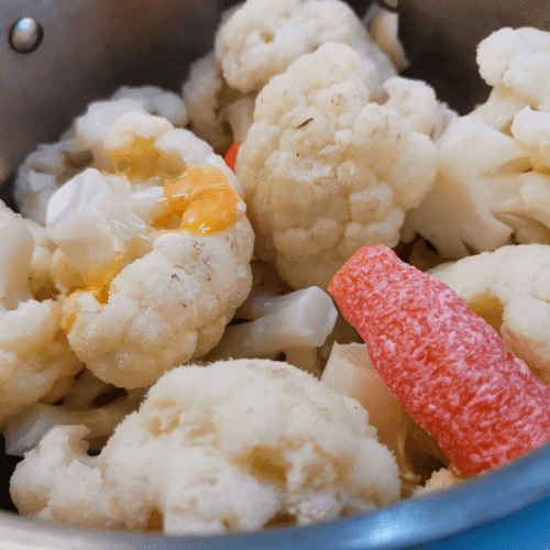 Как только овощи будут готовы, слить воду. Влить сливки и добавить желток.