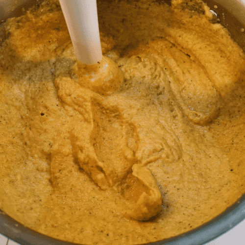 Приправить черным перцем и интенсивно взбить погружным блендером до однородной консистенции. Попробовать и немного досолить. Тем не менее вкус должен быть нежным, но не пресным.