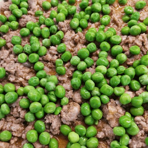 В форме для запекания распределить фарш, сверху добавить размороженный зеленый горошек.