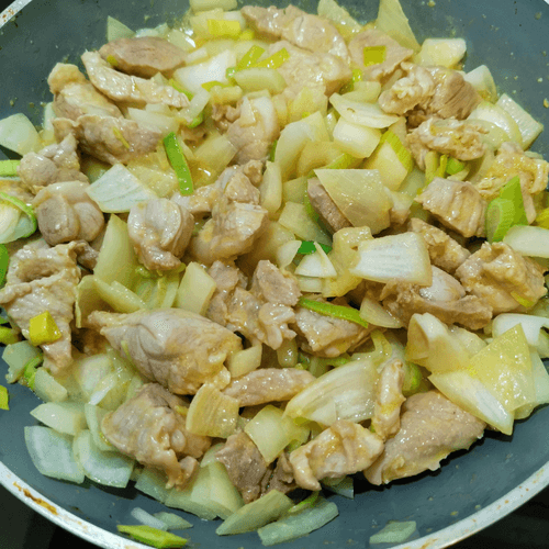 Через 3–4 минуты добавить лук и перемешать.
