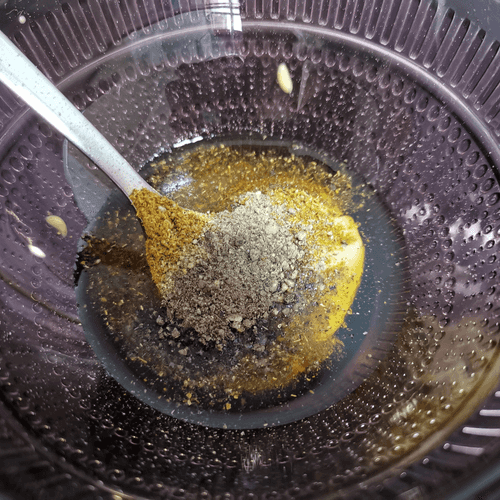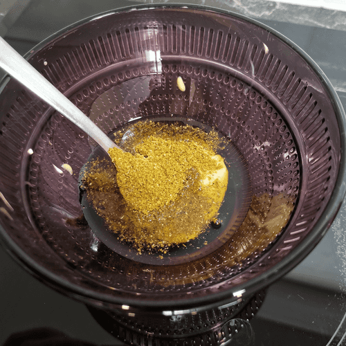 Смешать в глубокой миске горчичное масло, горчицу и хмели-сунели.