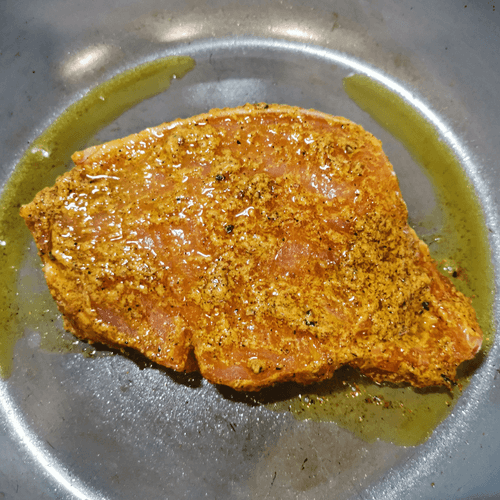 Смазать мясо со всех сторон получившимся маринадом и отправить на раскаленную сковороду.