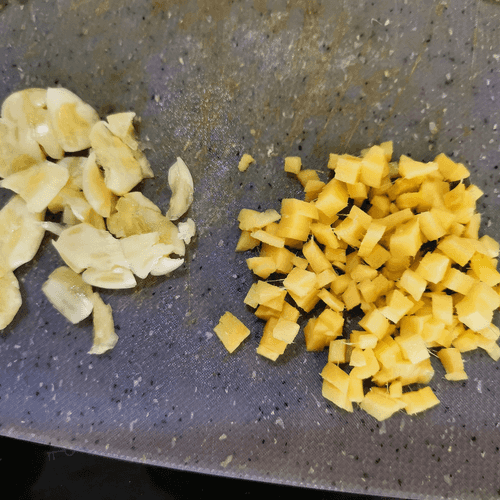 Чеснок раздавить поварским ножом, имбирь мелко нарезать.