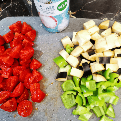 Баклажан, перец и помидоры крупно нарезать. Помидоры посолить.