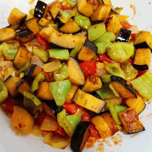 Перец и баклажан отправить на сковороду. Добавить еще кусочек сливочного масла и ложку горчичного.