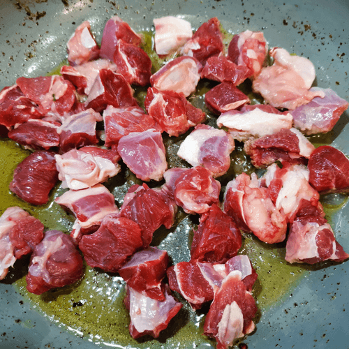 Влить в сковороду еще 2 ложки горчичного масла и отправить в него некрупно нарезанное мясо. Обжаривать на сильном огне.