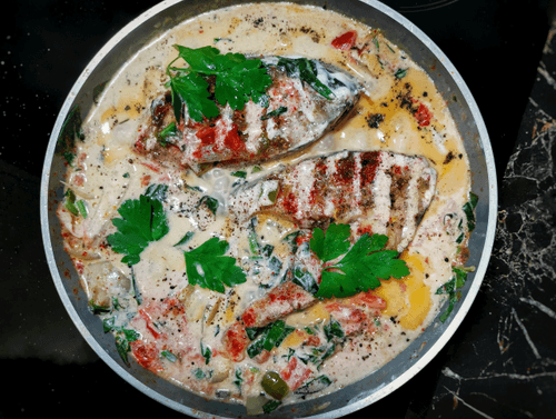 Стейк из карпа на сливочно-овощной подушке — это настоящее гастрономическое произведение искусства, сочетающее богатство вкусов и нежную текстуру. Карп, пропитанный сливочным и оливковым маслом, приобретает мягкость и насыщенный вкус, а сочетание свежих овощей — лука, сладкого перца, шпината и томатов — добавляет блюду яркость и сочность. Особую нотку вносят тархун и белый перец, создавая утонченный аромат. Завершают композицию густые сливки и сметана, превращая соус в шелковистую нежность. Этот рецепт — идеальный выбор для тех, кто хочет попробовать что-то оригинальное из рыбы, наслаждаясь ее мягкостью и гармонией вкусов. Блюдо подается горячим и отлично сочетается с бокалом белого вина или легким гарниром, подчеркивая его утонченную природу.